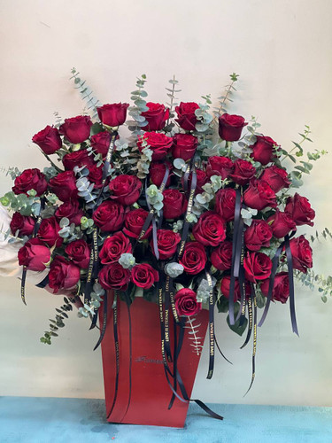 باکس گل رز قرمز با اکالیپتوس